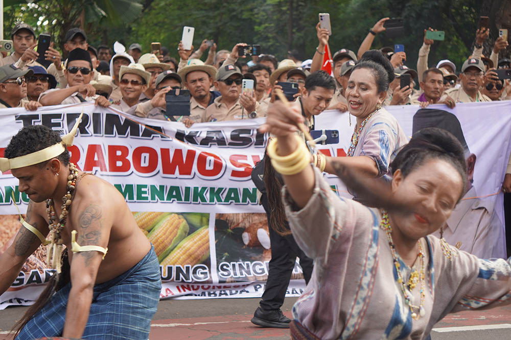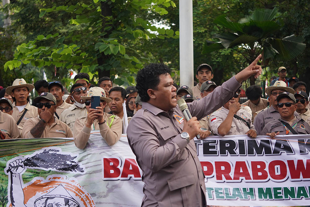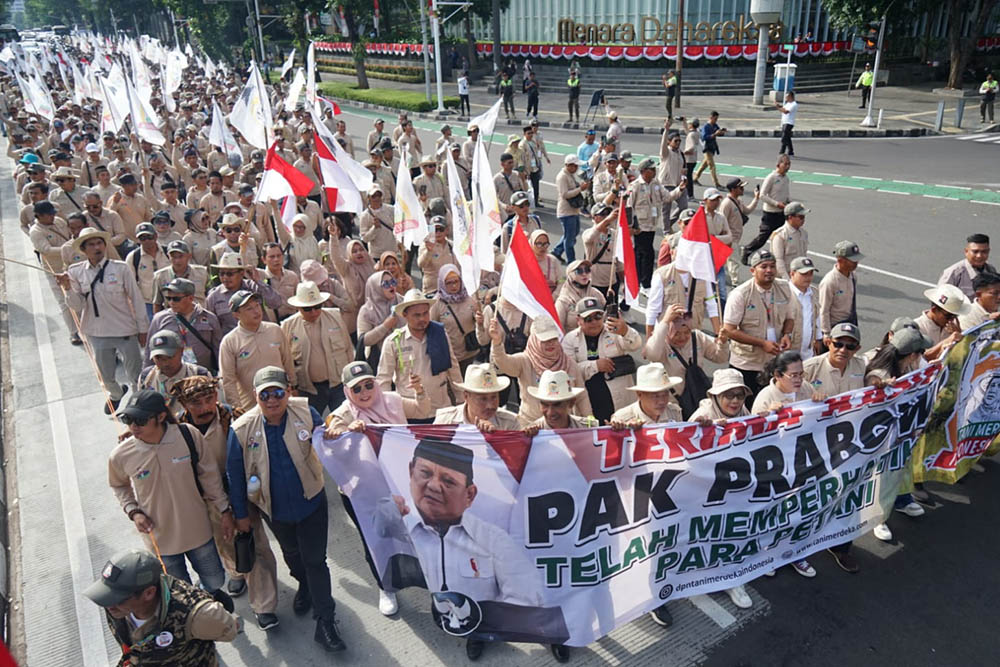 Dalam aksi ini, mereka menyuarakan dukungan penuh terhadap berbagai program Presiden Prabowo Subianto, mulai dari swasembada pangan, pengembangan food estate, penyediaan pupuk bersubsidi, hingga pembangunan lumbung pangan di setiap kabupaten.