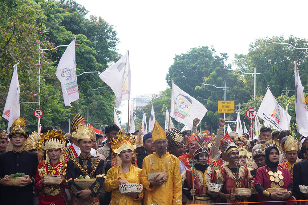 Sejumlah massa petani, nelayan, buruh tani, hingga pengusaha yang tergabung dalam Tani Merdeka Indonesia menggelar aksi damai di kawasan Patung Kuda, Jakarta Selatan, Kamis 28 Agustus 2025.